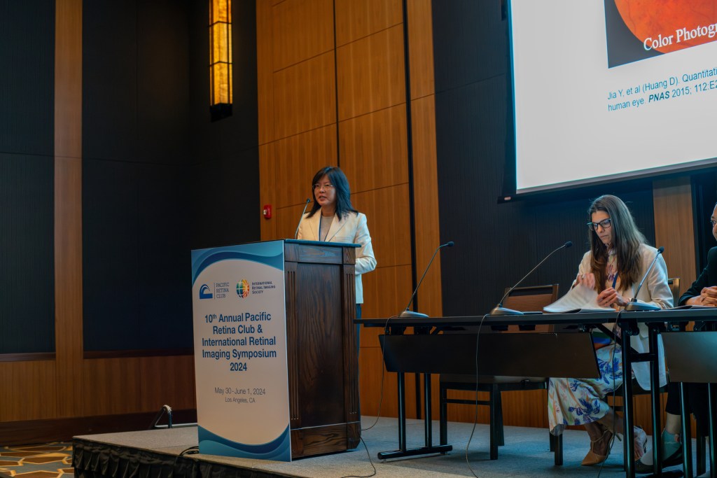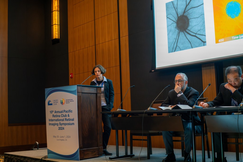From University of Paris Cité, Dr. Valérie Krivosic started the session with her discussion of OCTA findings in macular telangiectasia and how these vascular changes may serve as a biomarker for disease progression.20 Next Dr. Nadia Waheed from New England Eye Center, shared exciting work with Dr. James Fujimoto using variable interscan time analysis OCTA (VISTA) for studying blood flow in microaneurysms in patients with diabetic retinopathy.21 Following the presentation, she and Dr. Bailey Freund proposed hypotheses regarding the relationship between blood flow speed and clinical retinal fluid leakage.