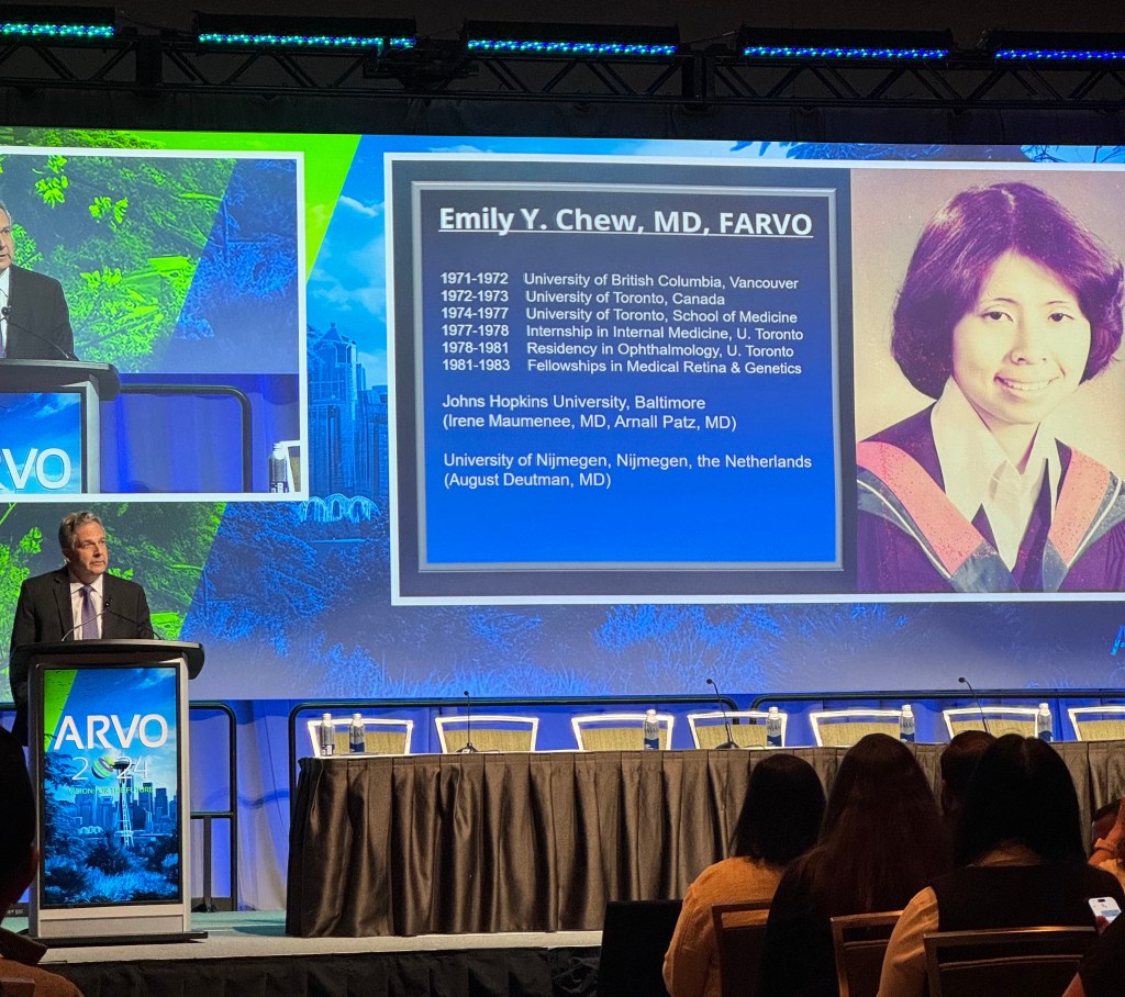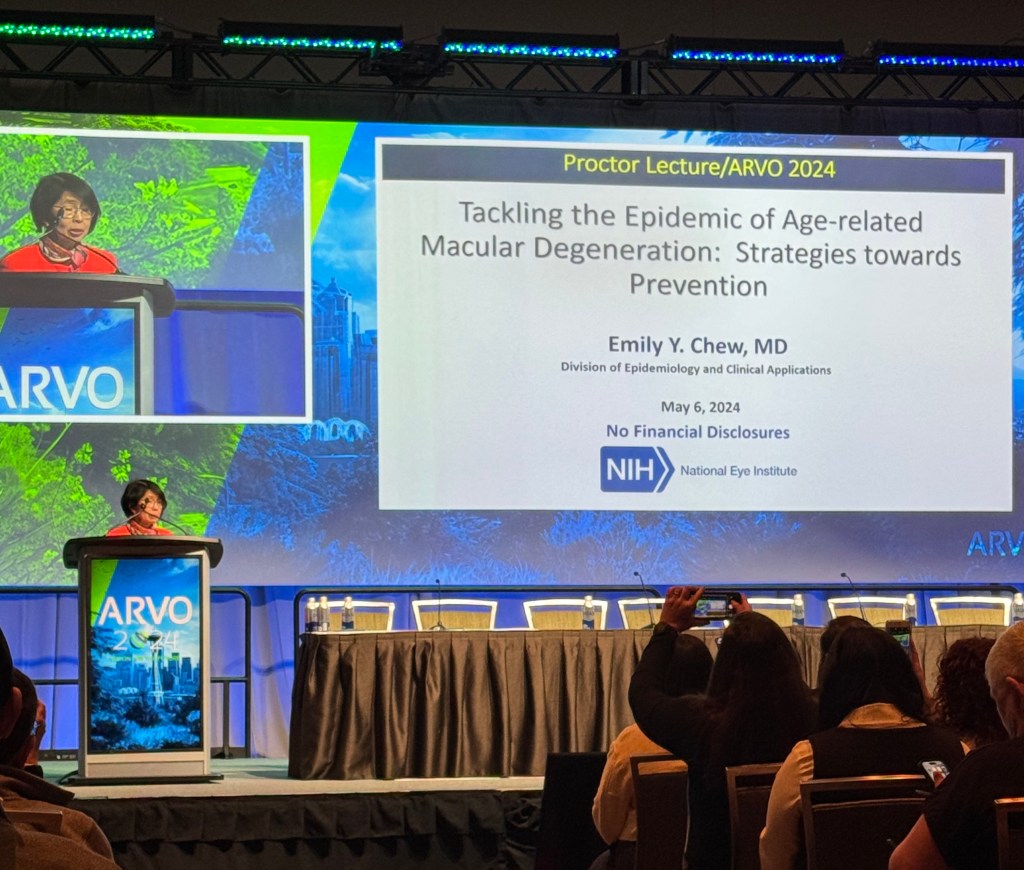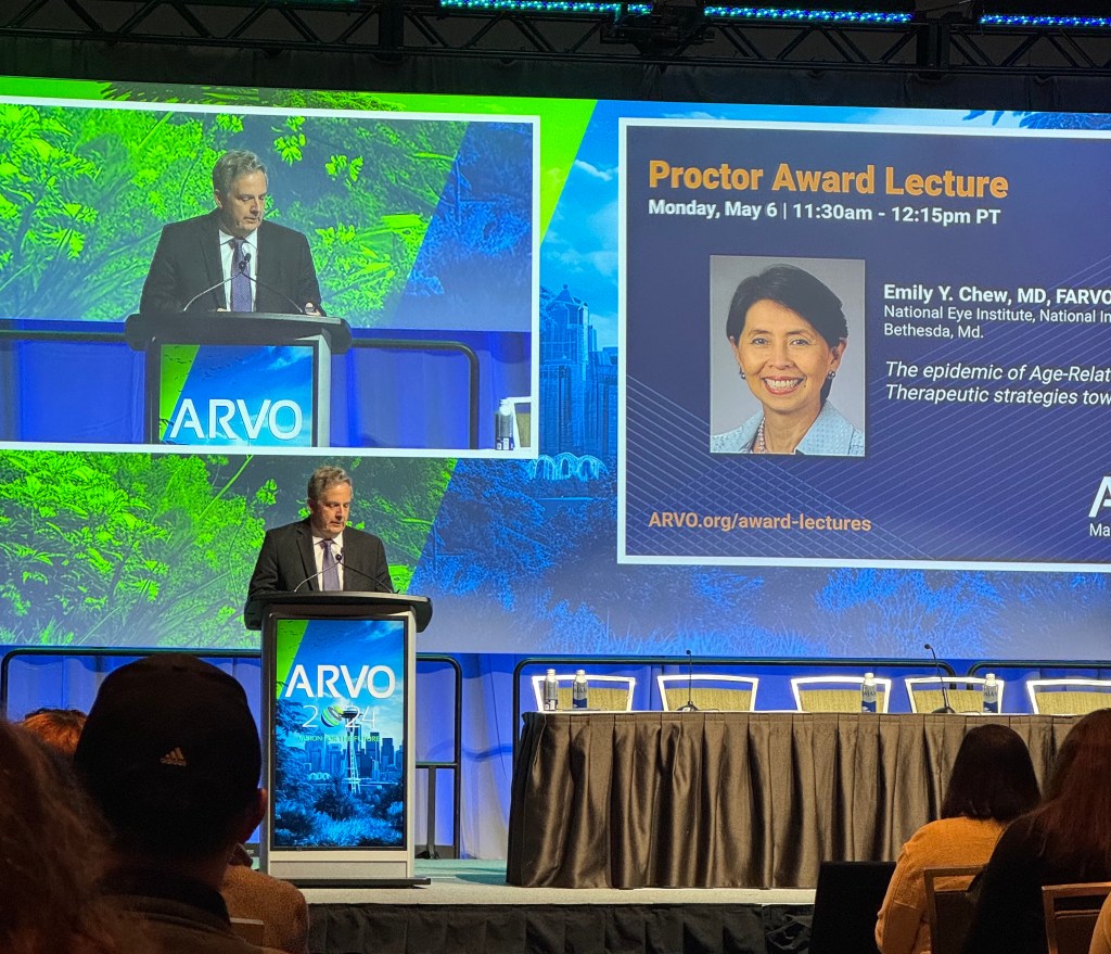 The Proctor award honors outstanding research in the basic or clinical sciences. This year’s Proctor awardee, Dr. Emily Chew, delved into the discovery of nutrition in advanced AMD prevention in her talk entitled “The epidemic of age-related macular degeneration: therapeutic strategies towards prevention.”