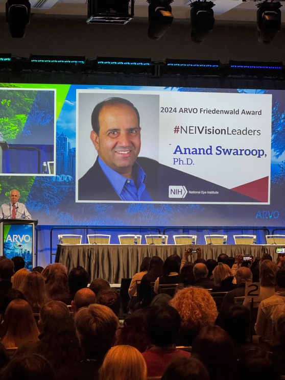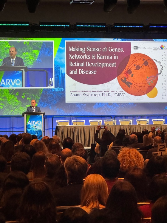The 2024 Friedenwald award was awarded to Dr. Anand Swaroop, Ph.D., who is a Senior Investigator and Chief of Neurobiology, Neurodegeneration, and Repair Laboratory (his favorite acronym, NRL) at the National Eye Institute. This prestigious award acknowledged Dr. Swaroop’s outstanding contributions to retinal development, aging, and neurodegeneration in visual science. His lecture was titled, “Making Sense of Genes, Networks, and Karma in Retinal Development and Disease.”
