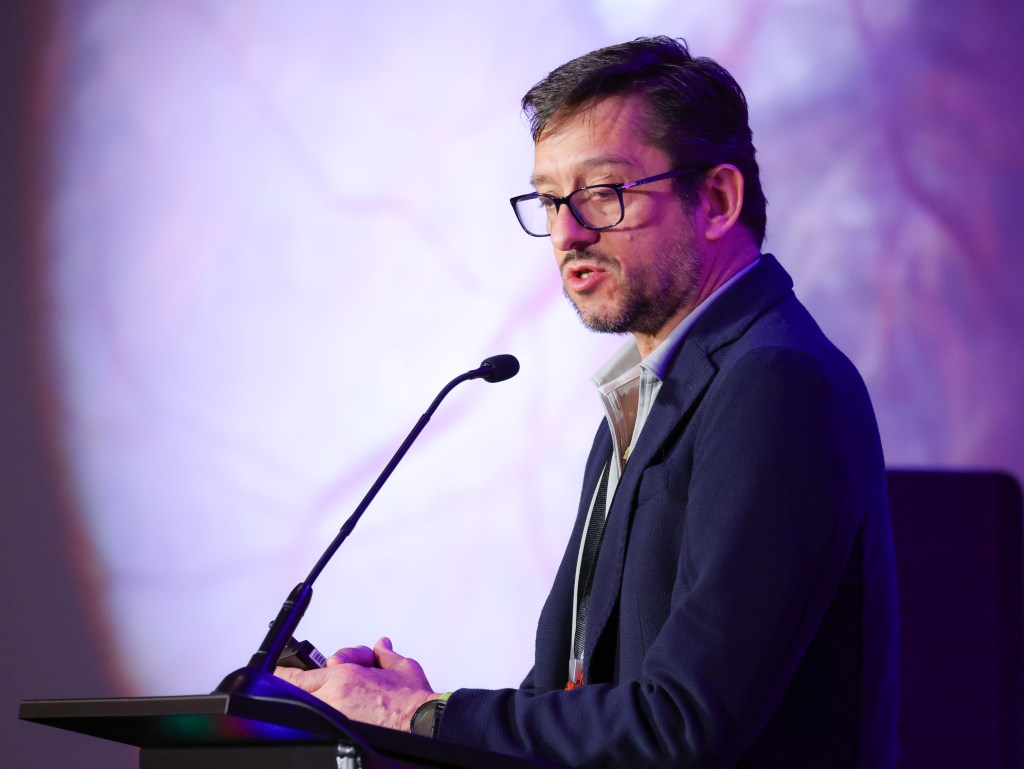 Next, Dr. Gabriela Lopez Carasa (South) and Dr. Flavio Rezende (North) discussed repair of complex RDs in highly myopic eyes. Dr. Lopez proposed using polytetrafluoroethylene (PTFE) felt, a biocompatible, porous polymer used in vascular grafting, as a macular indentation or buckling device. In a patient with myopic tractional maculopathy, she induced hypotony by placing sclerotomy ports, anchored a small piece of PTFE felt with Mersilene suture, and used a Snellen loop to place the felt under the macula. She used intra-operative ultrasound and OCT to place the felt into the precise location of the staphyloma and was able to verify shortening of the patient’s axial length from 36 to 32mm. Following surgery, the patient’s macular SRF was resolved and vision improved.