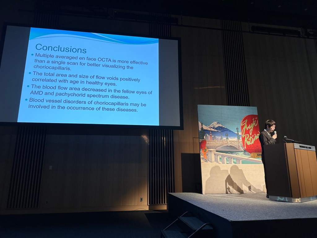 Dr. Sotaro Ooto from Kyoto University, Japan, kicked off the session with his presentation titled “Choriocapillaris Imaging by Averaging Multiple En Face OCTA Images.” Dr. Ooto introduced a novel technique for acquiring high-resolution images of the choriocapillaris by averaging out data from nine individual 3×3-mm OCTA scans. This method allowed for a detailed analysis of the choriocapillaris, showing a correlation between the area and size of flow voids with aging in healthy individuals. Furthermore, a decrease in blood flow area was observed in individuals with one eye affected by age-related macular degeneration (AMD) or pachychoroid spectrum disease, suggesting an early involvement of choriocapillaris blood vessel disorders in these diseases. Dr. Ooto’s findings highlight the importance of using multiple averaged en face OCTA scans for a clearer visualization of the choriocapillaris.