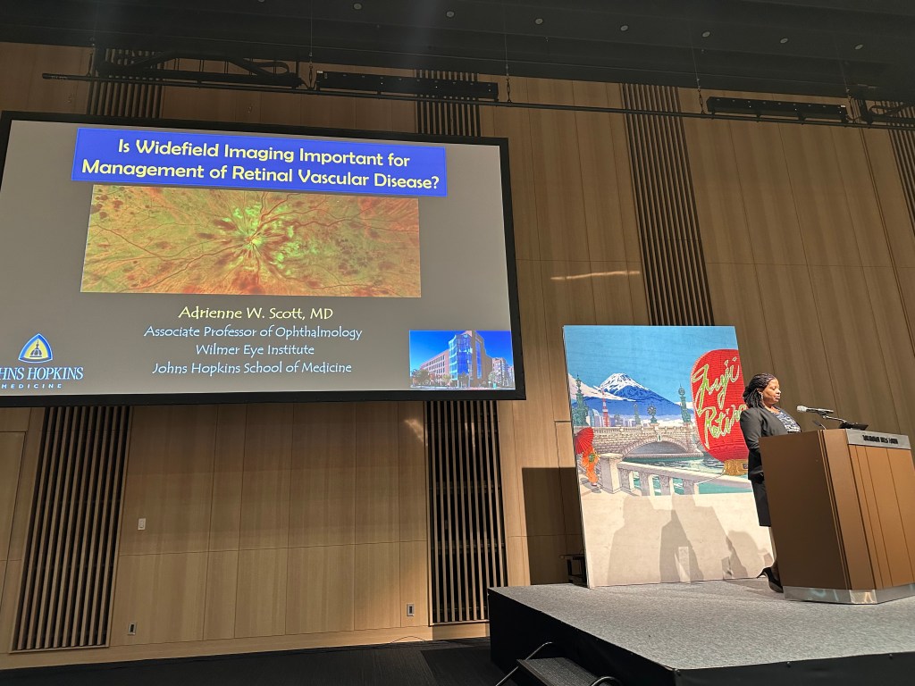 Next, Dr. Adrienne Scott from the Wilmer Eye Institute at Johns Hopkins University School of Medicine, USA, presented insights into the utility of ultra-widefield imaging in retinal diseases and provided an update on the management of proliferative sickle cell retinopathy. Dr. Scott underscored the advantages of ultra-widefield (UWF)1 imaging over traditional methods, particularly for diagnosing and managing retinal vascular diseases. Dr. Scott explained that UWF imaging provides a broader view of the retina, uncovering important details about conditions such as diabetic retinopathy, which are often overlooked by standard imaging techniques. She referred to the DRCR Protocol AA findings, which demonstrated that predominantly peripheral lesions (PPL) identified through UWF color retinal imaging did not predict a significant, 2-step deterioration on the Diabetic Retinopathy Severity Scale (DRSS).2 Dr. Scott’s discussions revealed how UWF imaging offers a comprehensive view of the retina, aiding in the detection and treatment guidance of conditions such as diabetic retinopathy. Despite its benefits, challenges like image distortion, the need for specialized knowledge, and higher costs were acknowledged. She also explored the potential future applications of UWF imaging in improving our understanding of retinal diseases and its integration into artificial intelligence and screening programs.