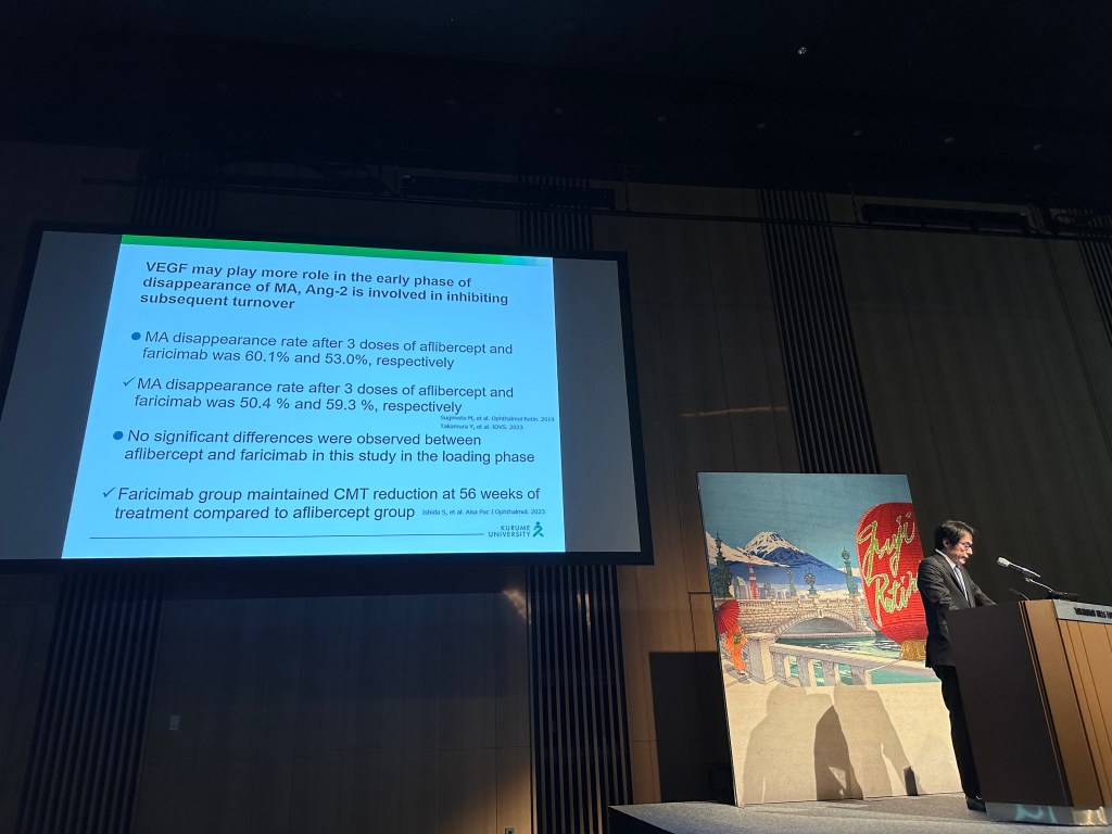 Dr. Shigeo Yoshida from Kurume University, Japan, presented “Microaneurysms in the Treatment of DME.” He reported on a study evaluating the effect of intravitreal faricimab (IVF) on the reduction of microaneurysms (MA) compared with those treated with intravitreal aflibercept (IVA). Both the IVA and IVF groups demonstrated a significant reduction in central macular thickness (CMT) and improvement in visual acuity after three injections. Regarding the number of MAs, over 50% disappeared after three consecutive injections, yet no differences were observed in CMT, visual improvements, or the reduction of MAs between the two groups.
