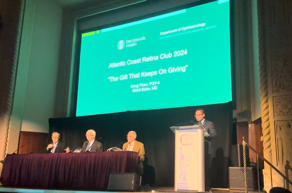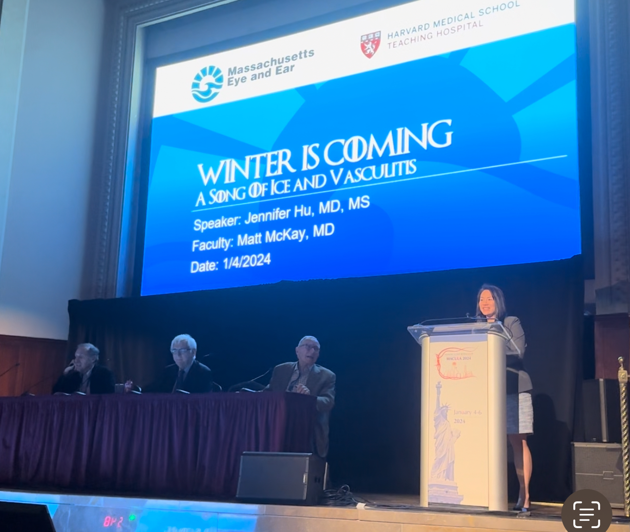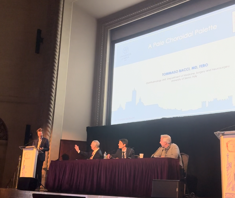 Session 1 of the trainee mystery cases started with Dr. Rolika Bansal, an oncology fellow from Wills, who presented a case of choroidal metastasis from breast cancer with an excellent response to abemaciclib/fulvestrant. This was followed by Dr. Cong Phan, a resident from Dartmouth, who presented a patient with Loeys-Dietz Syndrome with retinal detachment in one eye requiring multiple surgeries, followed by multifocal choroiditis complicated by CNVM in the fellow eye. Dr. Freund and others from the audience raised the important point that multifocal choroiditis is a typical presentation of sympathetic ophthalmia which is likely in this patient given the history.