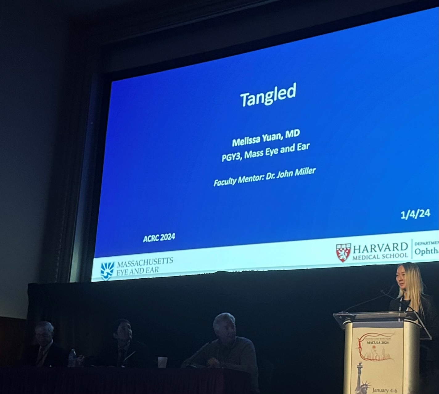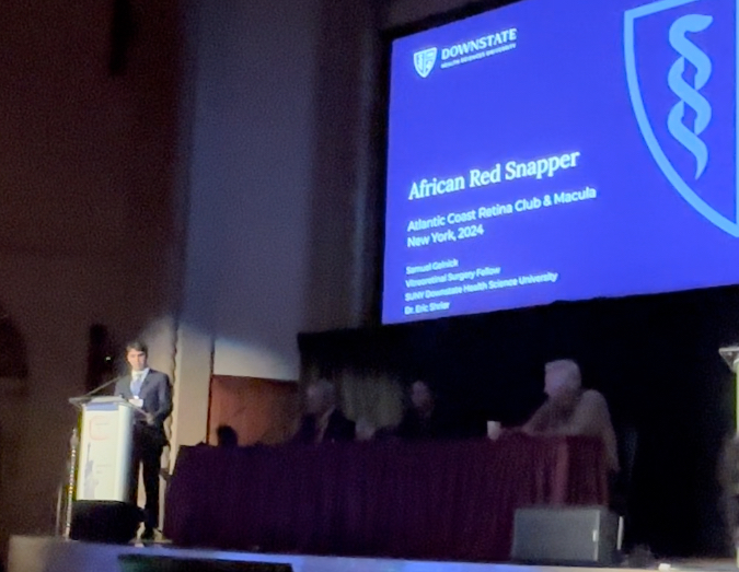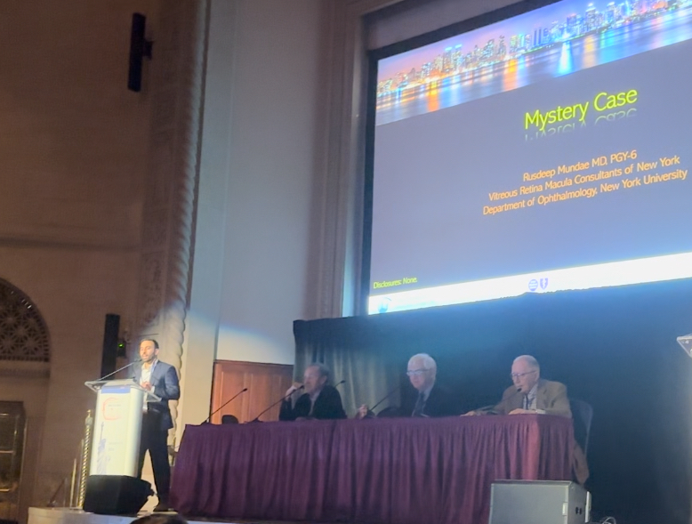 Dr. Jennifer Hu, a fellow from Mass Eye and Ear, shared a case of frosted branch angiitis, a nonocclusive venular involving vasculitis. A presumed viral illness was thought to be the inciting incident, and the vasculitis resolved after systemic steroids. Next up was Dr. Rusdeep Mundae, a fellow from Vitreous Retina Macula Consultants of New York. He presented a case of intra-scleral Miragel remnants causing scleral perforation. Dr. Shields and others in the audience made the diagnosis as soon as the history of RD repair in the 1980s was revealed.