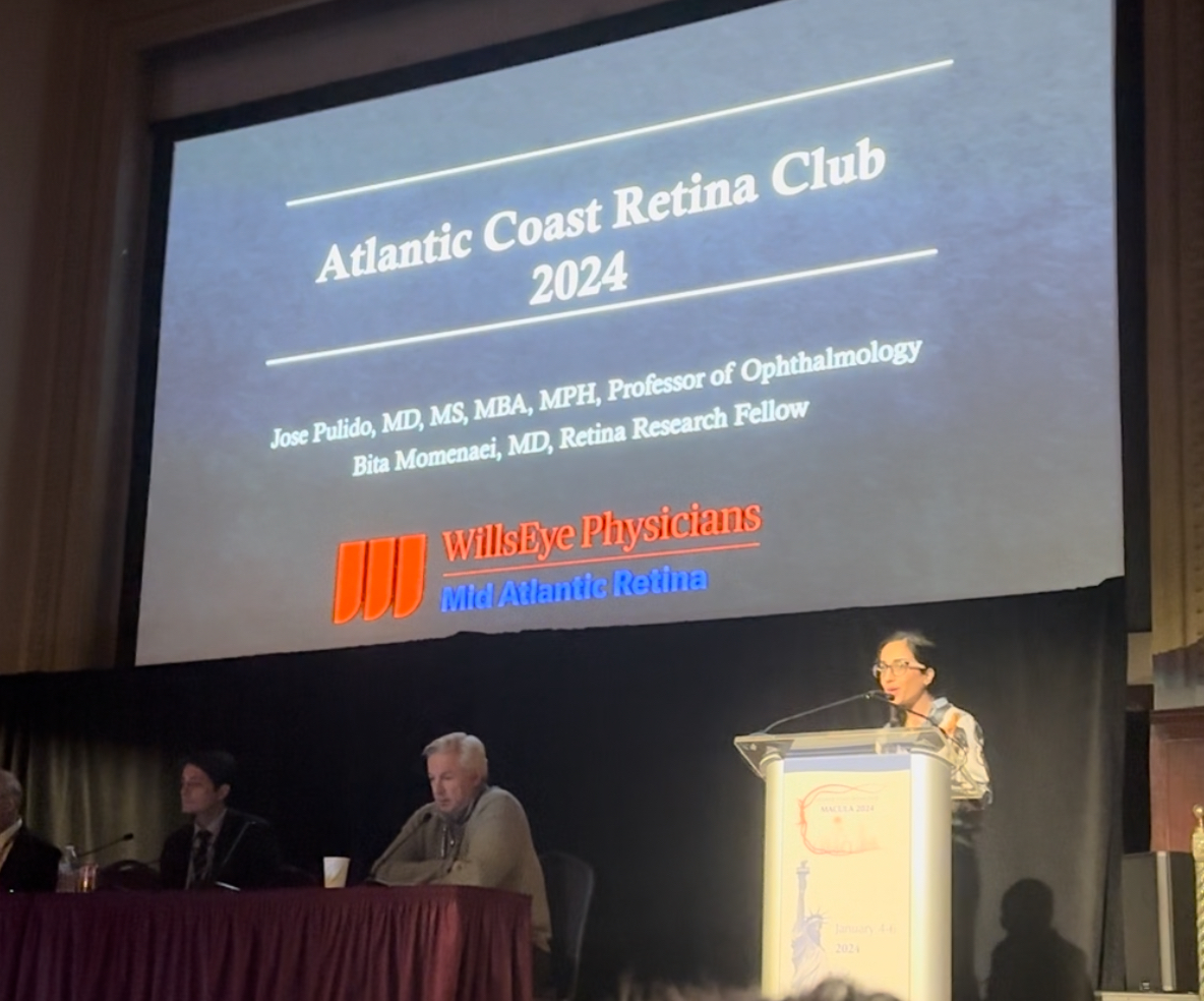 Dr. Sidra Zafar, a resident from Wilmer, then shared a case of orbital and choroidal B cell lymphoma presenting with unilateral exudative retinal detachment and choroidal folds. Drs. Pulido and Jampol commented on the importance of further differentiating subtypes of B cell lymphoma with molecular markers given the board spectrum of diseases and their differential responses to treatments. This was followed by Dr. Jonathan Noonan, a fellow from Columbia. He presented a case of bilateral retinal vasculitis likely secondary to a systemic inflammatory process given evidence of cerebral vasculitis on MRI, possibly GPA.