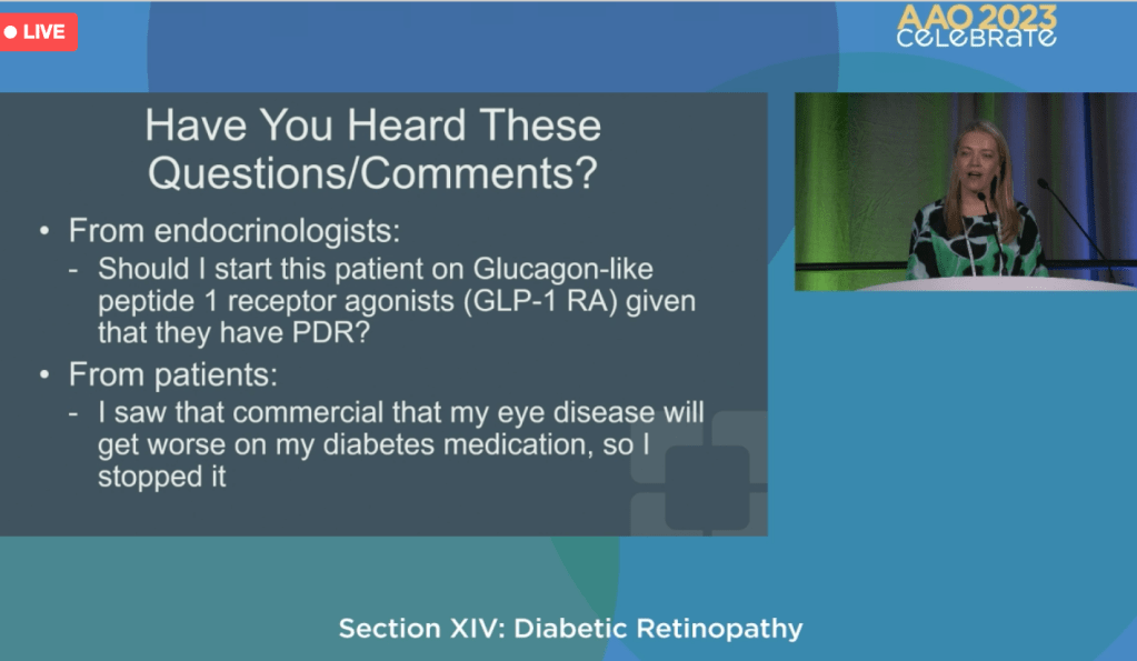 The second day of retina sub day at AAO 2023 included talks on the increasingly popular glucagon-like peptide (GLP-1) agonists such as semaglutide (Ozempic), dulaglutide (Trulicity), and liraglutide (Saxenda). Dr. Aleksandra Rachitskaya highlighted the interest in the potential relationship between the GLP-1 agonist medications and diabetic retinopathy (DR). Large studies, such as REWIND and LEADER, examined cardiovascular outcomes among patients with diabetes receiving GLP-1 agonists. They also reported that they found no association between GLP-1 agonists and DR progression. SUSTAIN 6, another large study, reported a higher risk of DR progression than placebo. These large studies primarily examined cardiovascular outcomes, not DR. Dr Rachitskaya also points out that the studies had inconsistent and limited documentation of DR staging, so she and her team sought to explicitly study the relationship between the medications and DR. She notes endocrinologists may express concern and seek ophthalmology guidance regarding the appropriateness of GLP-1 agonists in patients with known DR given these reports.