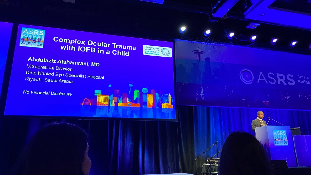 Dr. Abdulaziz A. Alshamrani, MD, presented a surgical case of ocular trauma with intraocular foreign body (IOFB) in a young child presenting with light perception (LP) vision. A heroic surgical effort that included pars plana vitrectomy (PPV) and lensectomy (PPL) with internal limiting membrane peel, endolaser, IOFB removal, and pupilloplasty was performed. At most recent follow up, this child was 20/100. The discussion focused on the timing of IOFB removal in real world situations versus the military trauma data with delayed IOFB removal after closure. There may be some benefit in delay to allow for propagation of the posterior vitreous detachment, but that must be weighed against the risk of endophthalmitis. In either case, it is important to start systemic and/or intravitreal antibiotics.