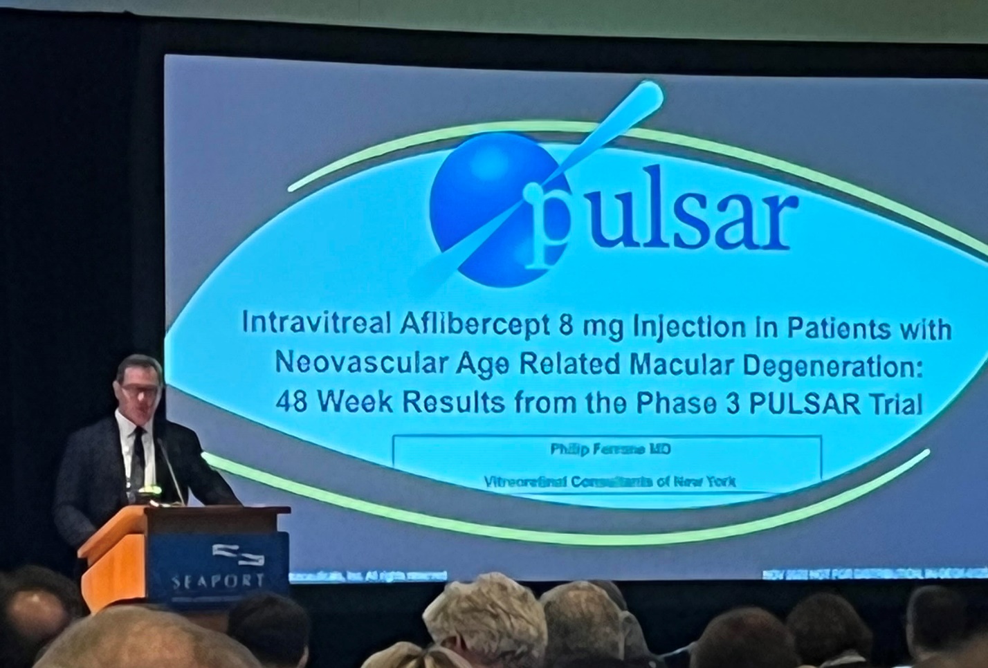 Philip J. Ferrone, MD from Vitreous Retina Macula Consultants of NY presented outcomes of the 48 week, phase 3 PULSAR study of high-dose aflibercept, which is 8mg injected in 0.07mL for treatment naïve neovascular AMD. The treatment groups included standard 2mg q8week intervals after 3 initial monthly loading injections (conventional dosing), 8mg q12 weeks after 3 initial monthly loading injections, and 8mg q16 weeks after 3 initial monthly loading injections. The 48 weeks results demonstrated noninferiority in visual acuity and central retina thickness between the three groups. 83% of patients in both the 8mg groups were maintained in at least 12 or more week intervals. At week 48, the mean number of injections was 6.9 injections in the 2mg at q8week group, 6.1 in the 8mg at q12 week group, and 5.2 in the 8mg q16 week group. The safety profile of aflibercept 8mg was consistent with the established safety profile of aflibercept 2mg, with no cases of intraocular inflammation, retinal vasculitis, occlusive retinitis, endophthalmitis, or systemic adverse events. There was no evidence of significant increased intraocular pressure (IOP) with aflibercept 8mg injected at 0.07mL. One of the audience questions posed was whether high dose aflibercept may be increase rate of geographic atrophy, which needs to be explored.