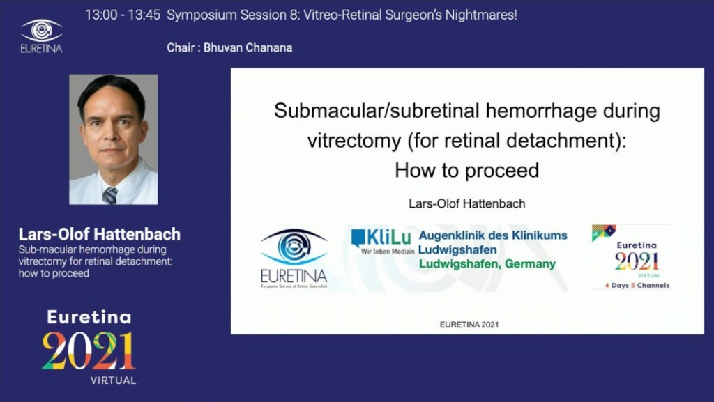 Dr. Lars-Olof Hattenbach, MD, professor of ophthalmology and chairman of the department of ophthalmology at Ludwigshafen Hospital, Germany, on the second day of EURETINA 2021, discussed the best ways to manage unexpected subretinal/submacular hemorrhage during vitrectomy for retinal detachment. It can be triggered by several risk factors, including underlying systemic diseases (hypertension, diabetes), neovascular posterior segment disorders, treatment with anticoagulant or antiplatelet agents, age and poor general status.