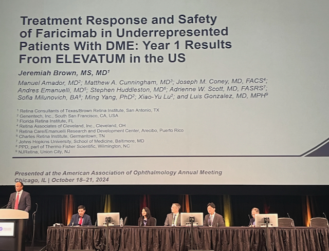 Dr. Jeremiah Brown presented results from ELEVATUM, which aimed to test the safety and efficacy of faricimab for treating DME in underrepresented patient populations. 154 treatment-naive patients with A1c less than 12 were enrolled, with 45% Hispanic, 45% African American, and 10% Native American and Pacific Islander patients. Patients received 6mg faricimab every 8 weeks, the same dosing protocol as used in the YOSEMITE and RHINE studies. Hispanic patients in ELEVATUM had significantly worse vision and DME and severity of diabetic retinopathy (DR) on initial enrolment as compared to African-American patients. Patients of all races and ethnicities had improved vision and DME after treatment with faricimab. Hispanic patients had the greatest improvement in vision and severity of DME and DR, possible because they had the most severe disease at enrollment. The safety profile of faricimab was similar in ELEVATUM as in YOSEMITE/RHINE, with zero cases of endophthalmitis. Panelists during the discussion pointed out that patients have much diversity that cannot be captured with categories of race alone, and that the many social determinants of health cannot be captured with these categories.